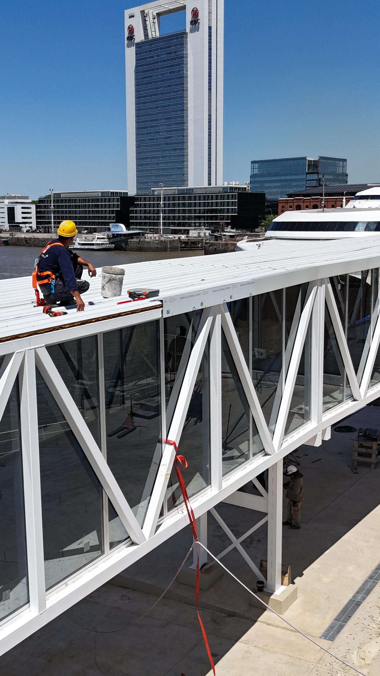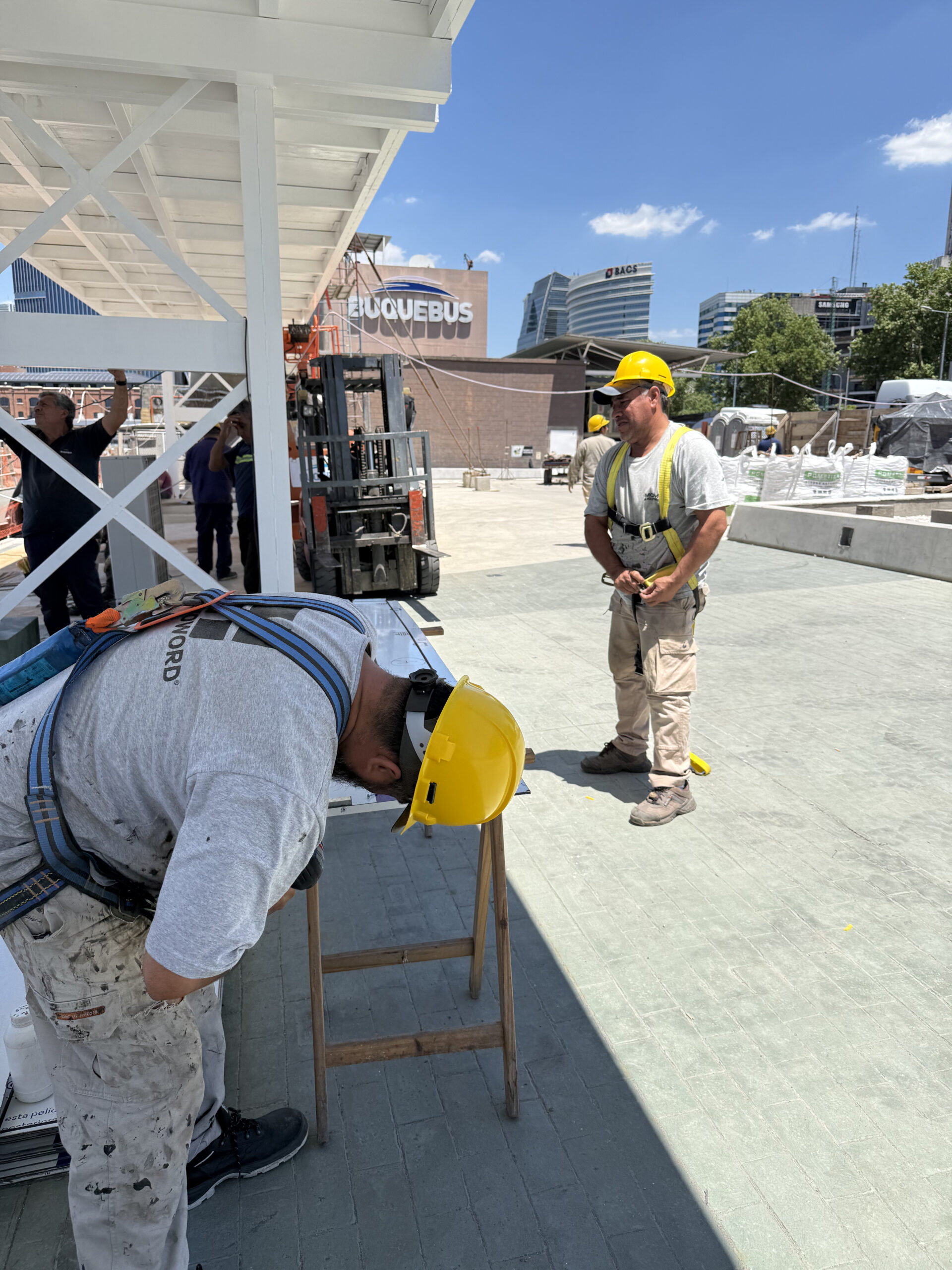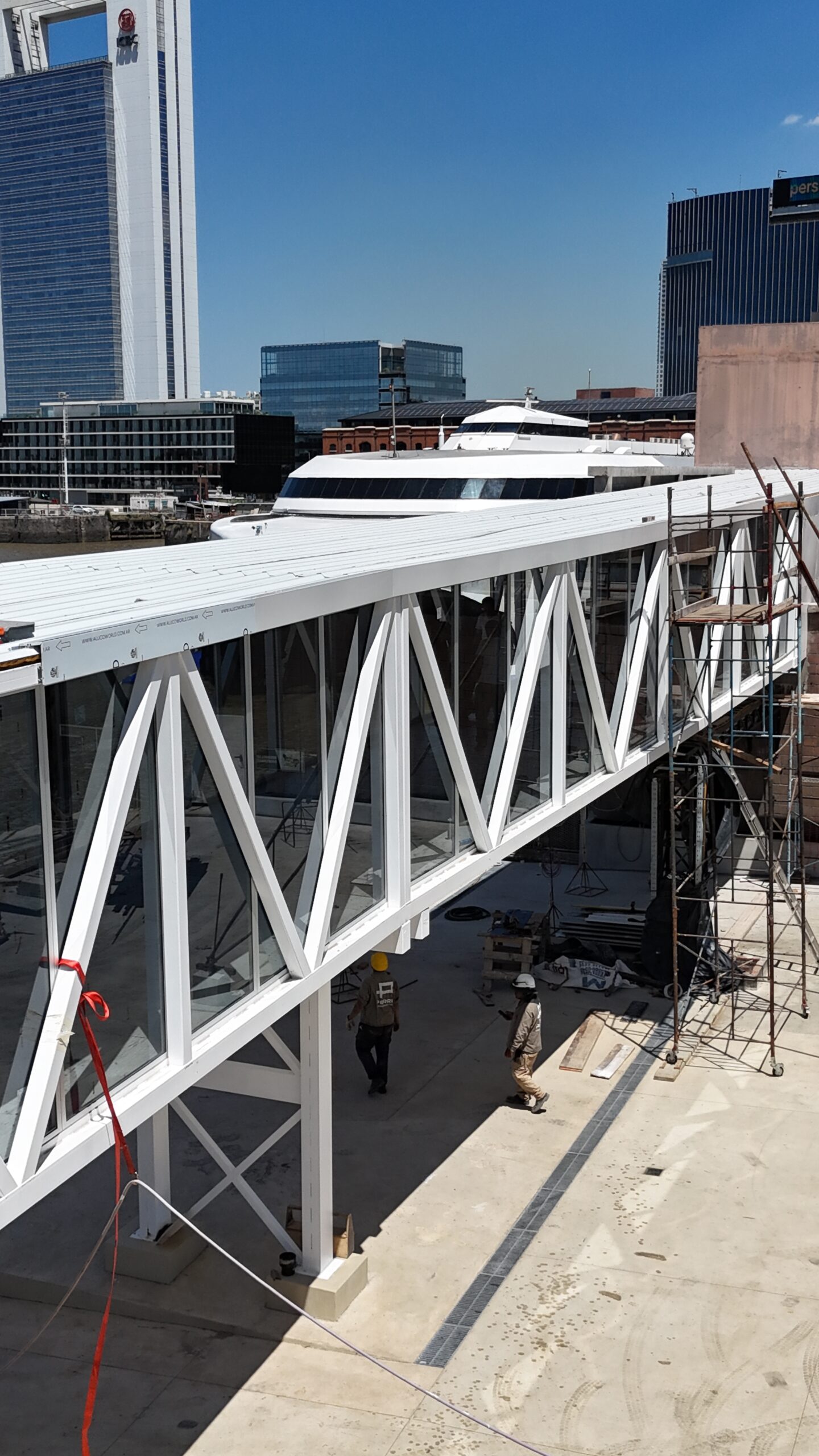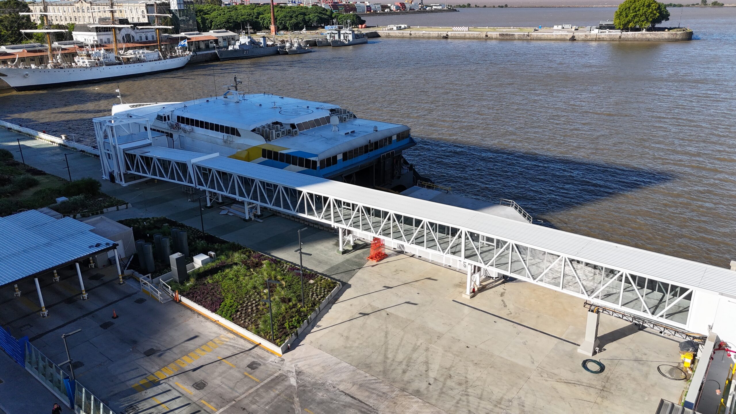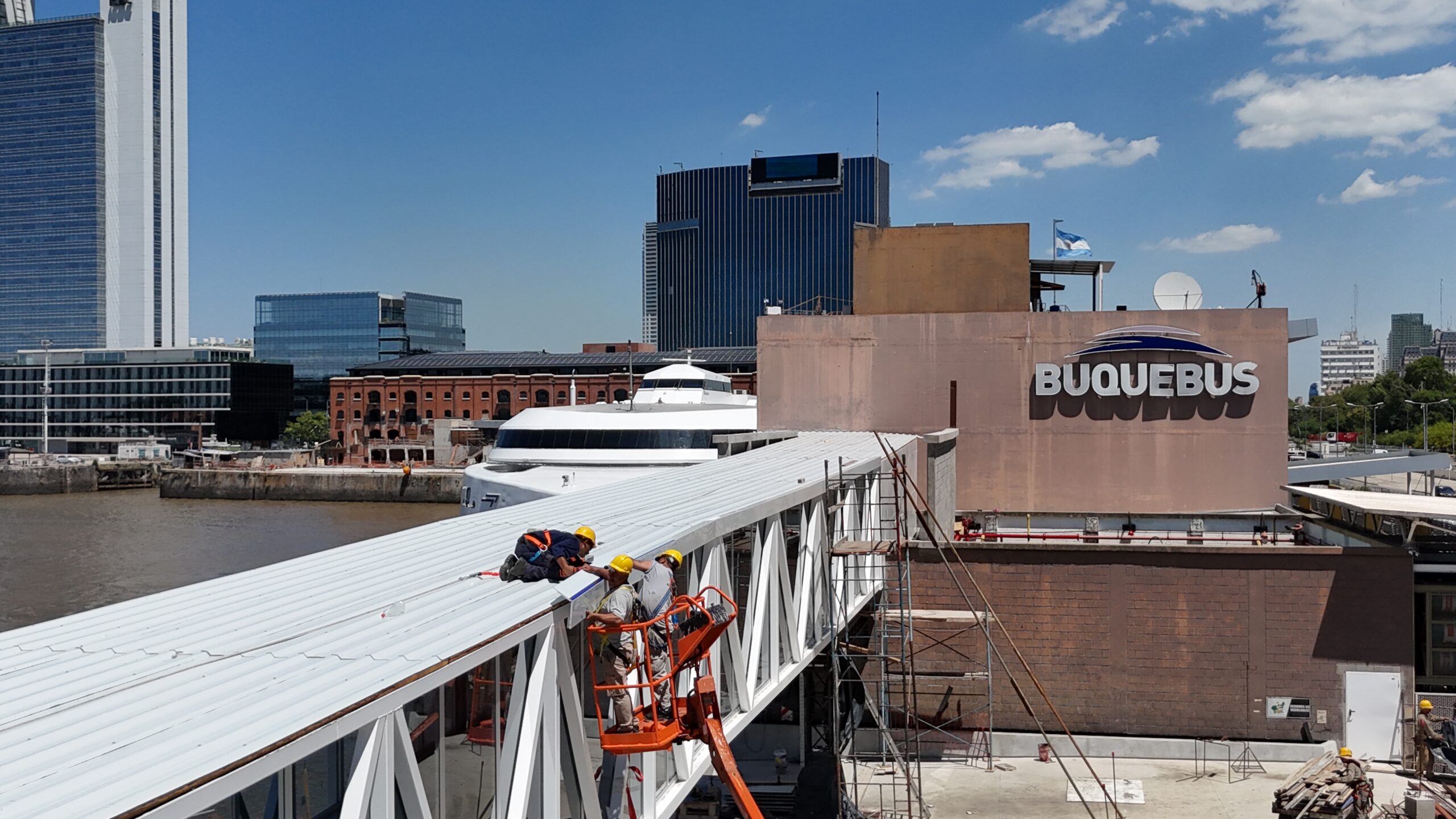 Compartimos la intervención realizada en la terminal de Buquebus, donde llevamos a cabo el revestimiento del puente de conexión interno.